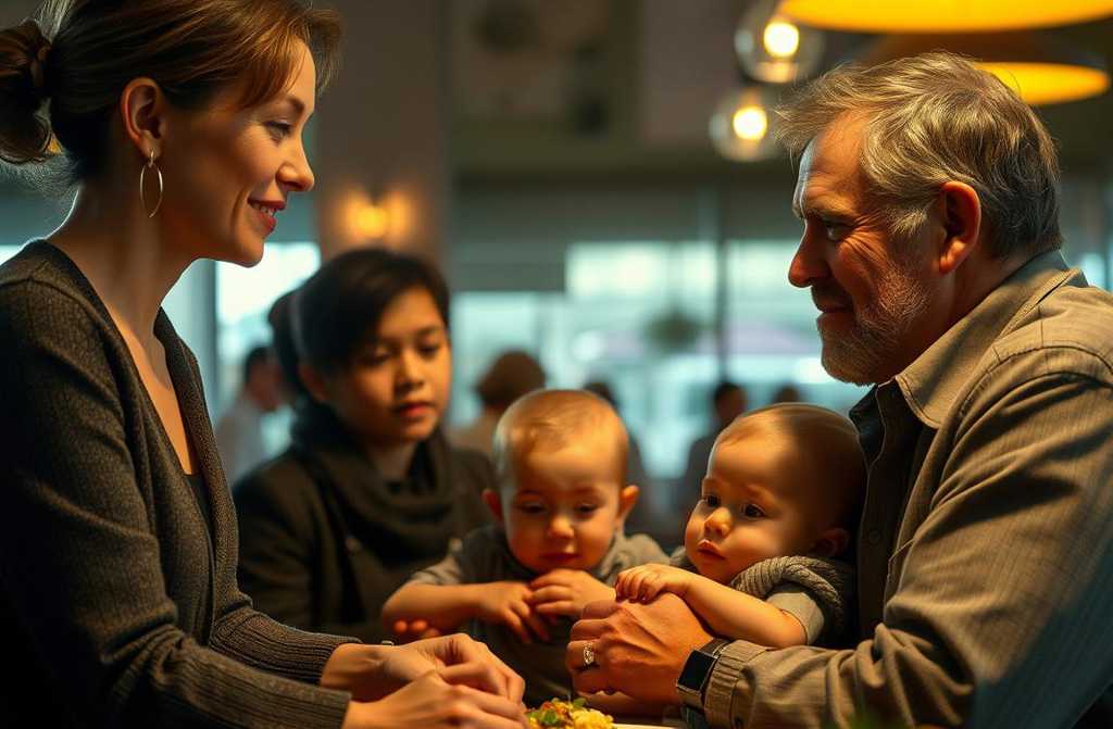Beatrice si irrigidì, la forchetta sospesa a mezzaria, e si voltò verso un uomo inginocchiato accanto al tavolo. Non doveva avere più di trentacinque anni, ma la vita lo aveva segnato. Sul petto, legati con uno straccio, portava due gemellini, i loro visini pallidi e scavati dalla fame. Indossava jeans strappati e una maglietta logora, sporca di polvere e sudore. Tremava, non per paura, ma per la fatica. Eppure, nei suoi occhi non cera vergogna, solo lamore disperato di un padre.