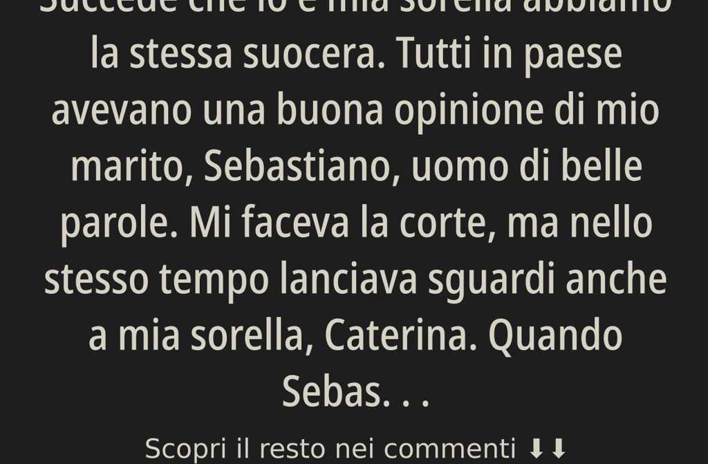 Tutti in paese avevano una buona opinione di mio marito, Sebastiano, uomo di belle parole. Mi faceva la corte, ma nello stesso tempo lanciava sguardi anche a mia sorella, Caterina. Quando Sebastiano scoprì che mia nonna aveva lasciato a me, e non a Caterina, il suo appartamento a Parma, si affrettò a chiedermi di sposarlo.