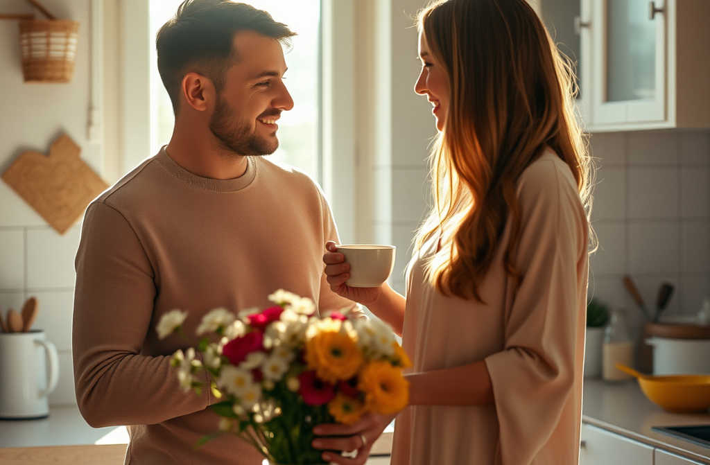 Quando si apre la porta, trova casa pulita, il marito in grembiule che porta in tavola la cena e i fiori.