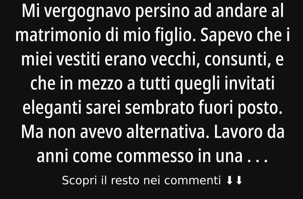 Mi vergognavo persino ad andare al matrimonio di mio figlio. Sapevo che i miei vestiti erano vecchi, consunti, e che in mezzo a tutti quegli invitati eleganti sarei sembrato fuori posto. Ma non avevo alternativa.