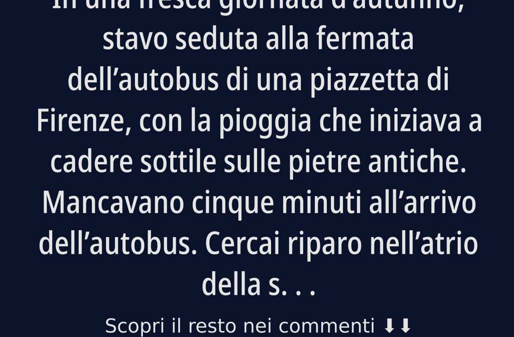 In una fresca giornata dautunno, stavo seduta alla fermata dellautobus di una piazzetta di Firenze, con la pioggia che iniziava a cadere sottile sulle pietre antiche. Mancavano cinque minuti allarrivo dellautobus. Cercai riparo nellatrio della stazione, e mi accomodai su una panca di legno, tirando fuori il telefono per leggere le ultime notizie. Accanto a me si sedette una signora anziana dal viso pieno di energia, con occhi che sembravano aver visto mille primavere. Subito si mise a parlare, bramosa di compagnia. Scambiammo due parole sul tempo uggioso; era loquace, e presto cominciò a raccontarmi la sua storia.