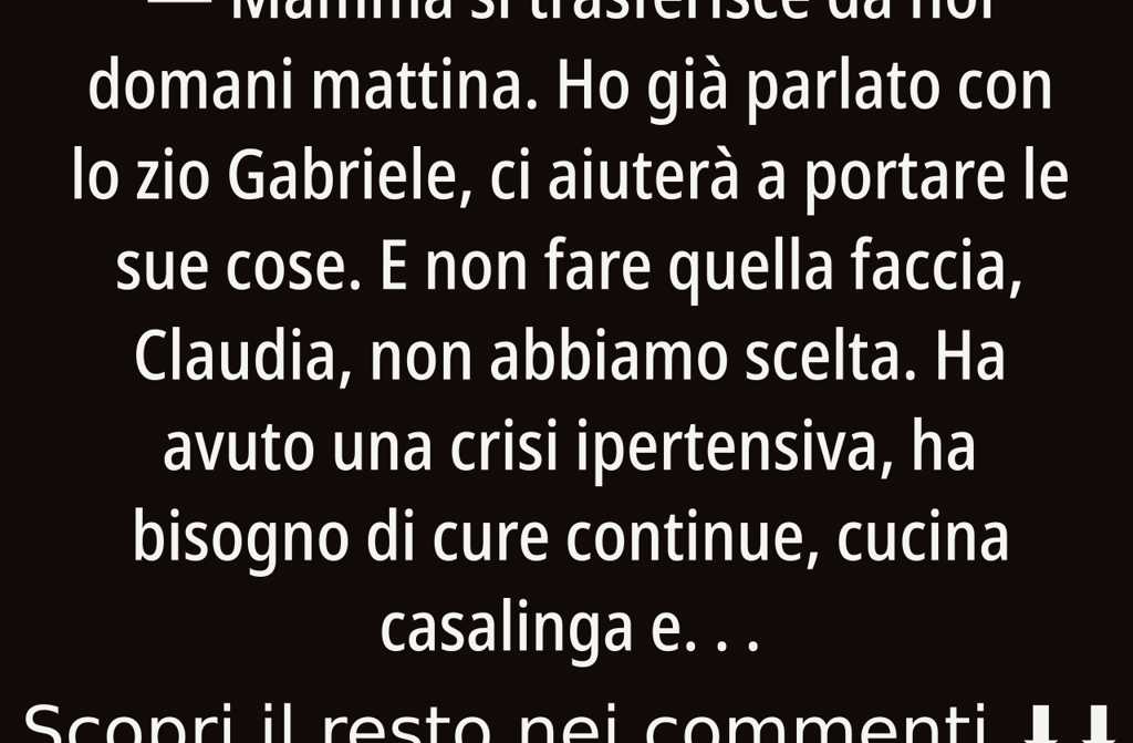 Mamma si trasferisce da noi domani mattina. Ho già parlato con lo zio Gabriele, ci aiuterà a portare le sue cose. E non fare quella faccia, Claudia, non abbiamo scelta. Ha avuto una crisi ipertensiva, ha bisogno di cure continue, cucina casalinga e tranquillità. Tu comunque lavori da casa, quindi non ti costerà nulla darle un piatto di minestra e misurarle la pressione ogni tanto.