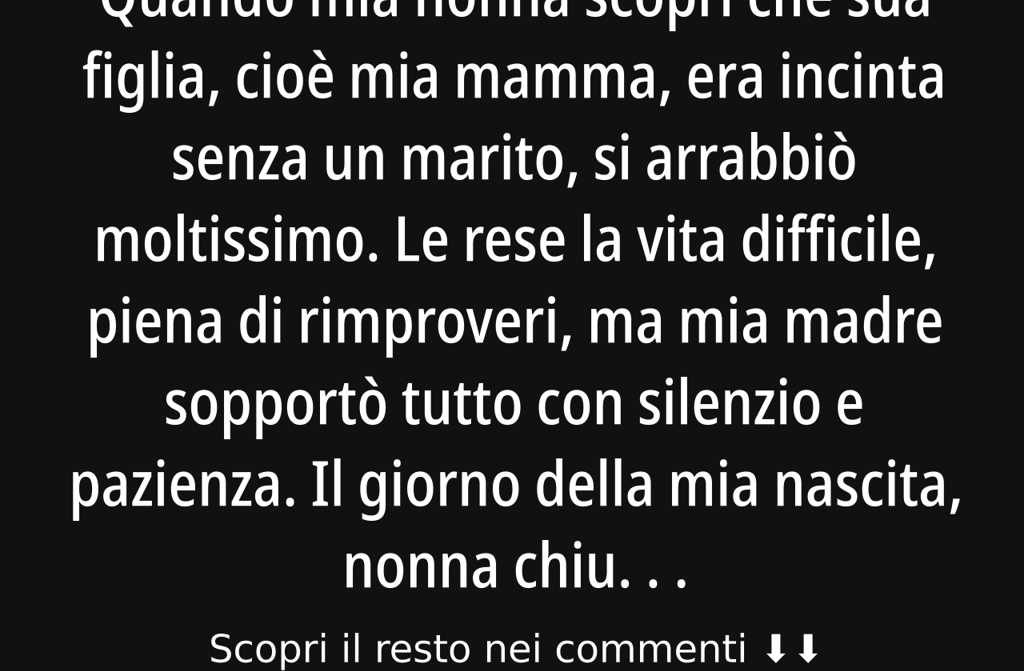 Quando mia nonna scoprì che sua figlia, cioè mia mamma, era incinta senza un marito, si arrabbiò moltissimo. Le rese la vita difficile, piena di rimproveri, ma mia madre sopportò tutto con silenzio e pazienza.
