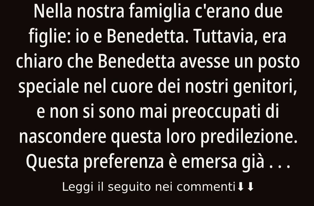 Nella nostra famiglia c’erano due figlie: io e Benedetta. Tuttavia, era chiaro che Benedetta avesse un posto speciale nel cuore dei nostri genitori, e non si sono mai preoccupati di nascondere questa loro predilezione. Questa preferenza è emersa già durante l’infanzia di Benedetta. Lei riceveva sempre le cose migliori, mentre io avevo solo ciò che rimaneva. Inoltre, Benedetta assomigliava molto ai nostri genitori, con una bellezza tipicamente italiana. Al contrario, io avevo i tratti di mio zio paterno, che non era considerato affascinante secondo gli standard comuni. Persino i miei genitori mi chiamavano brutta senza troppi giri di parole.