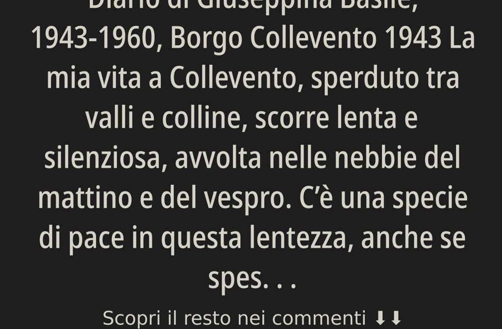 La mia vita a Collevento, sperduto tra valli e colline, scorre lenta e silenziosa, avvolta nelle nebbie del mattino e del vespro. Cè una specie di pace in questa lentezza, anche se spesso sa di solitudine. Mi chiamano tutti con rispetto, Giuseppina Basile: dicono che sono donna forte, che mantengo la parola, che lavoro senza lamentarmi. Ho sposato Giovanni Basile appena compiuti i diciotto anni, come si usa da noi. Nel 37 è venuta al mondo la nostra Margherita, e, lanno dopo, Simonetta.