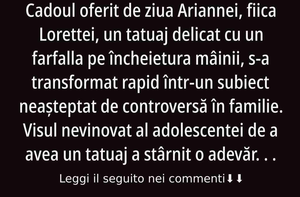 La final, părinții au fost încântați să-și vadă fiica fericită cu cadoul de ziua ei, iar Giuliana a rămas să reflecteze asupra schimbărilor vremurilor. Întrebarea persista: ar fi trebuit părinții să intervină mai mult, împiedicând-o pe Arianna să-și facă tatuajul? În realitate, răspunsul depinde de valorile fiecărei familii. Poate că uneori e nevoie să avem răbdare și să acceptăm că noua generație va avea alte vise, iar datoria celor mai în vârstă este să ofere iubire și îndrumare, nu judecăți aspre. În fond, viața ne arată mereu că respectul față de alegerile celorlalți și deschiderea către schimbare aduc armonie în familie.