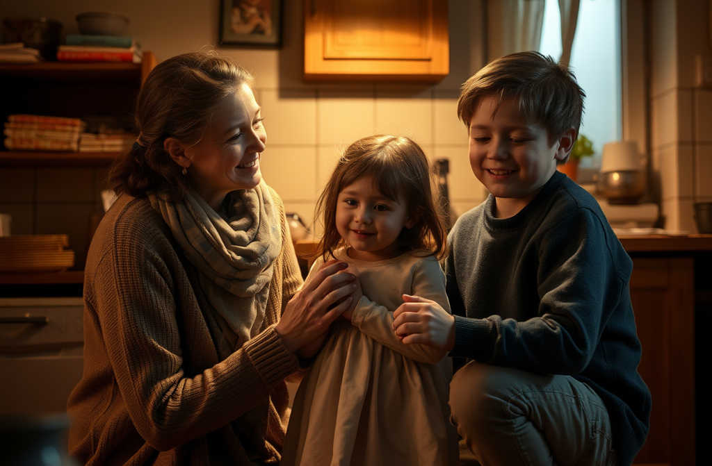 Col tempo Chiara si aprì. Si avvicinò a Giulia, giocò con Matteo, sorrise e parlò, anche se ancora qualche timore rimaneva verso Marco, un uomo che le ricordava le figure maschili dure della sua vita. Marco, però, la trattava con gentilezza e cautela. Aveva sempre sognato di avere una figlia, ma per motivi di salute Giulia non poteva più avere bambini. Quando Marco tornò da un viaggio di tre giorni, Giulia e Chiara lo accolsero. Si avvicinò a Chiara, la prese tra le braccia e, insieme, entrarono in cucina. Matteo e Luca li seguirono, tutti si abbracciarono, restando in silenzio ma con il cuore colmo di calore.