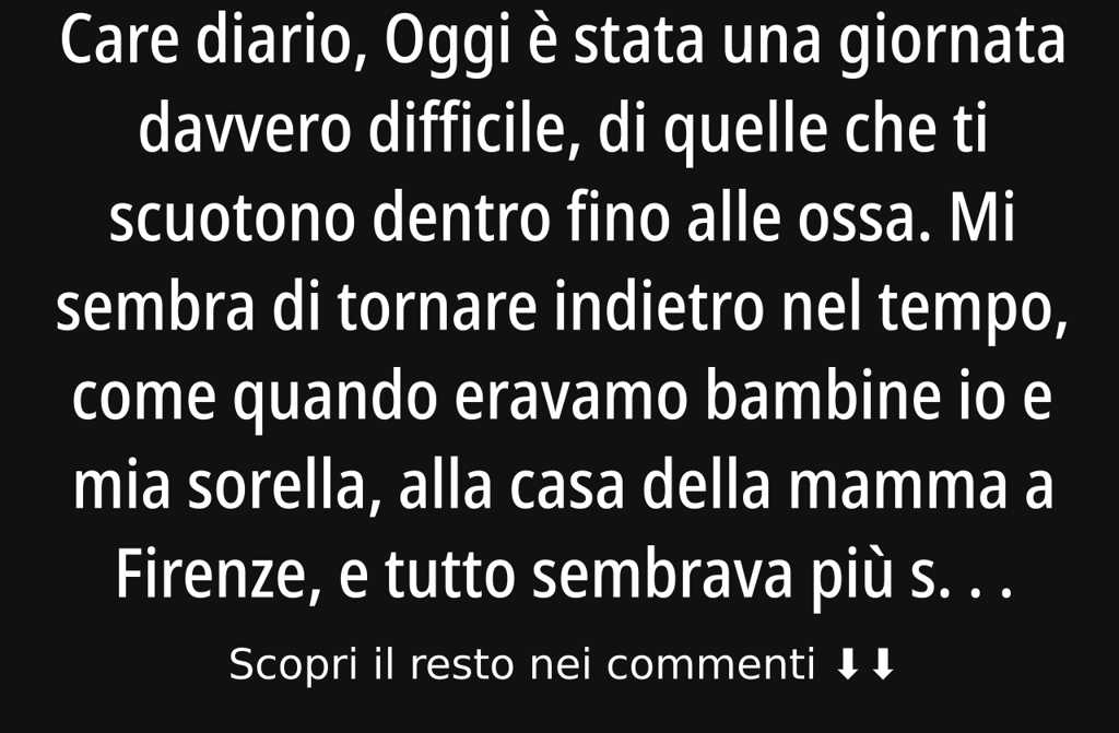 Oggi è stata una giornata davvero difficile, di quelle che ti scuotono dentro fino alle ossa. Mi sembra di tornare indietro nel tempo, come quando eravamo bambine io e mia sorella, alla casa della mamma a Firenze, e tutto sembrava più semplice, anche nei momenti complicati.