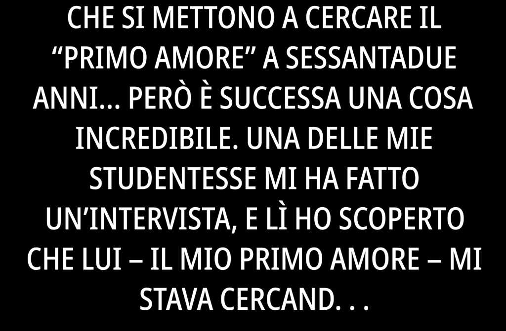 Sai, amica, я non sono di quelle che si mettono a cercare il primo amore a sessantadue anni però è successa una cosa incredibile. Una delle mie studentesse mi ha fatto unintervista, e lì ho scoperto che lui il mio primo amore mi stava cercando da quarantanni! E ti giuro, questo era solo linizio più avanti ho scoperto il suo vero passato. Lui è rimasto senza parole