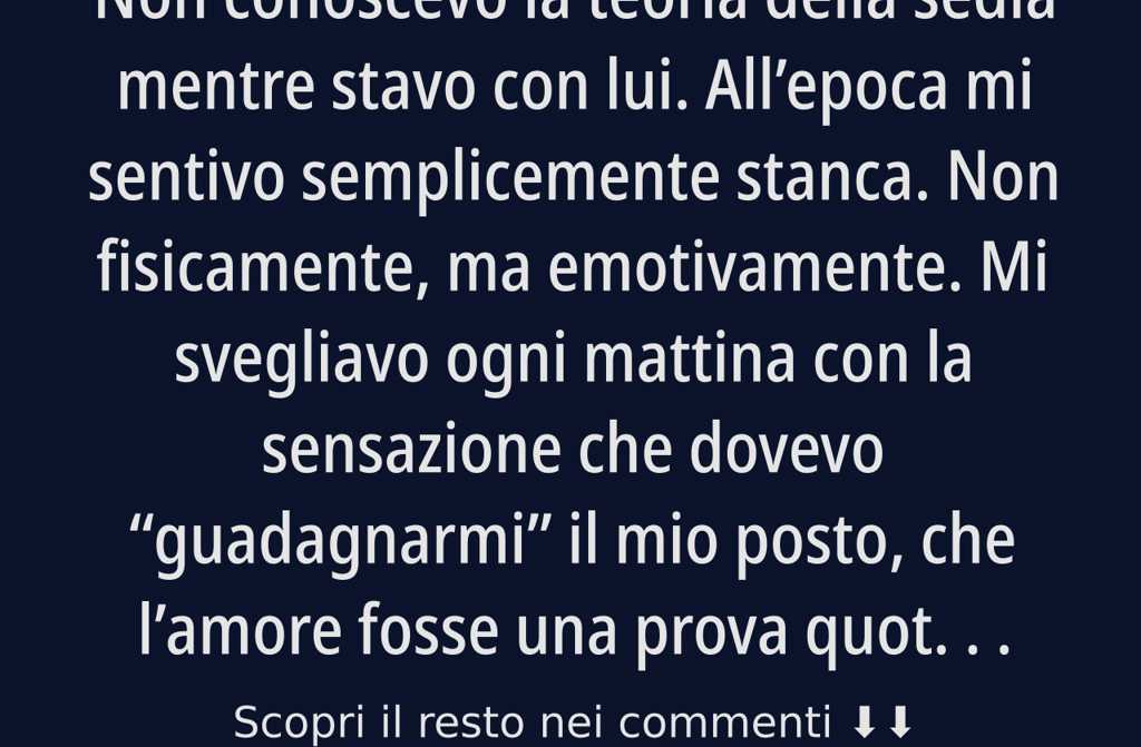 Non conoscevo la teoria della sedia mentre stavo con lui. Allepoca mi sentivo semplicemente stanca. Non fisicamente, ma emotivamente. Mi svegliavo ogni mattina con la sensazione che dovevo guadagnarmi il mio posto, che lamore fosse una prova quotidiana.