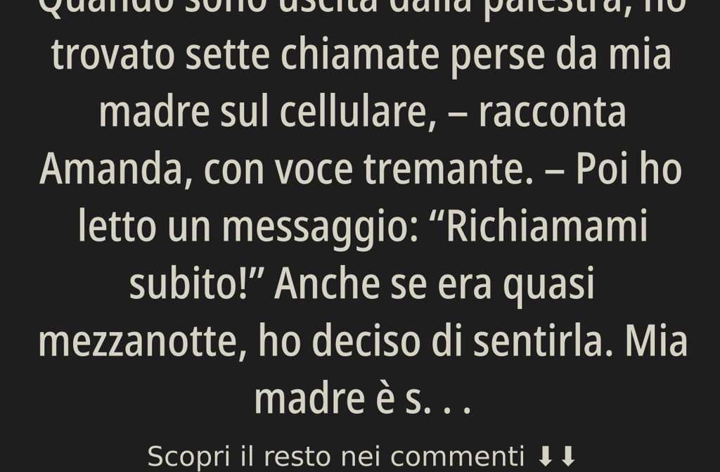 Quando sono uscita dalla palestra, ho trovato sette chiamate perse da mia madre sul cellulare, racconta Amanda, con voce tremante. Poi ho letto un messaggio: Richiamami subito! Anche se era quasi mezzanotte, ho deciso di sentirla. Mia madre è sempre un po ansiosa, capace di passare la notte in bianco per delle sciocchezze. Mi ha chiesto di andare da lei, piangendo, dicendo che era accaduto qualcosa di grave, che forse bisognava annullare il matrimonio.
