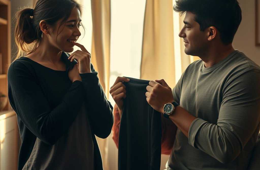 “Massimo, questo cosè?” chiese la ragazza con tono severo, tenendo in mano una camicia. “Questa macchia rosa qui? È rossetto? Eh? Ecco perché sei tornato tardi dal lavoro…”