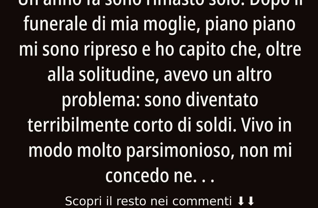 Un anno fa sono rimasto solo. Dopo il funerale di mia moglie, piano piano mi sono ripreso e ho capito che, oltre alla solitudine, avevo un altro problema: sono diventato terribilmente corto di soldi. Vivo in modo molto parsimonioso, non mi concedo nessun lusso, ma ci sono sempre spese impreviste, come quelle dei medicinali e delle visite mediche.