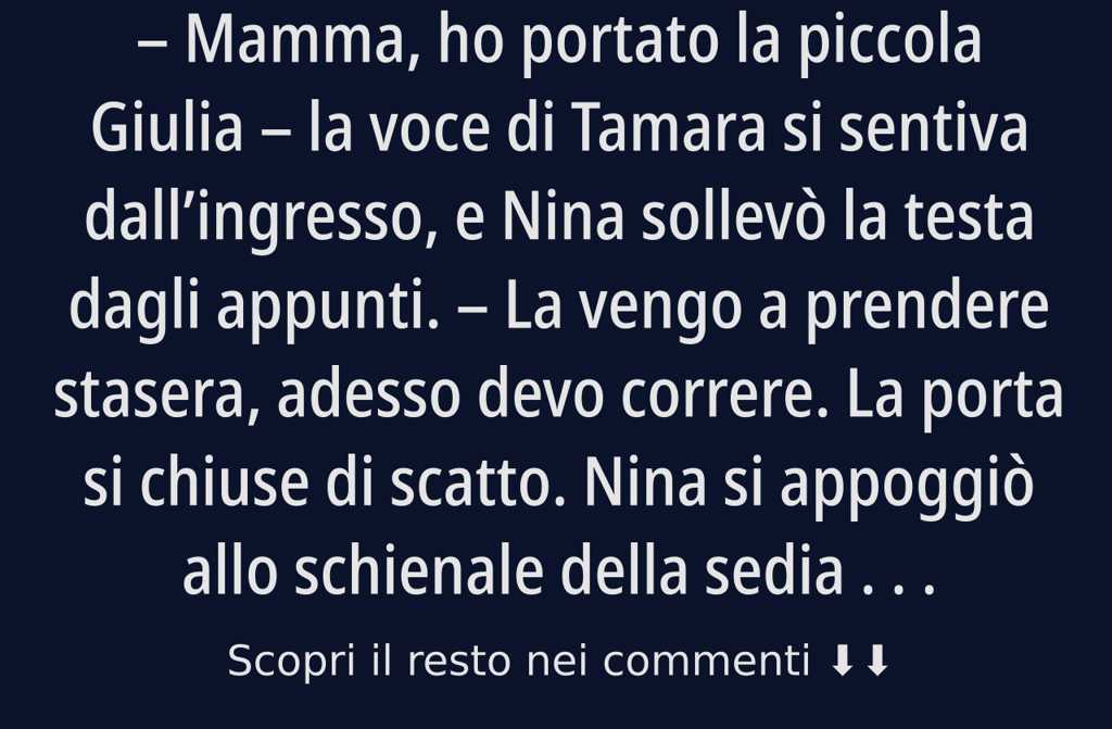 Nina tornò a casa verso le otto di sera, svuotata e stanca. Valentina era in cucina, stretta a una tazza di tè ormai fredda, e a vederla, parlò subito, tutta dun fiato, come se avesse temuto di non riuscire a dirlo.