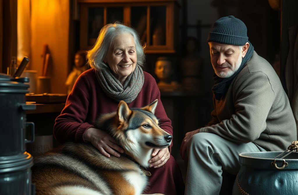 Entro sera Simone finisce il lavoro. Alma gli offre un pranzo caldo e una grappina. Luomo, rinfrancato, dà indicazioni indicando il cucciolo acciambellato vicino alla stufa.