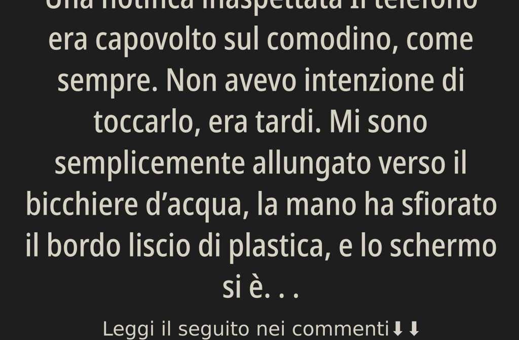 Il telefono era capovolto sul comodino, come sempre. Non avevo intenzione di toccarlo, era tardi. Mi sono semplicemente allungato verso il bicchiere dacqua, la mano ha sfiorato il bordo liscio di plastica, e lo schermo si è acceso da solo, per caso, come si accendono quelle cose che forse dovrebbero restare al buio.