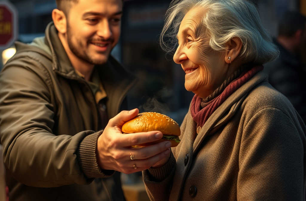 Iniziò a preparare il panino con una cura speciale. Scelse il panino più morbido, selezionò il pezzo più succulento di carne, aggiunse verdure fresche e versò la salsa come se stesse cucinando per la sua famiglia. Ne fece un altro identico e glielo porse con delicatezza, come due piccoli tesori.