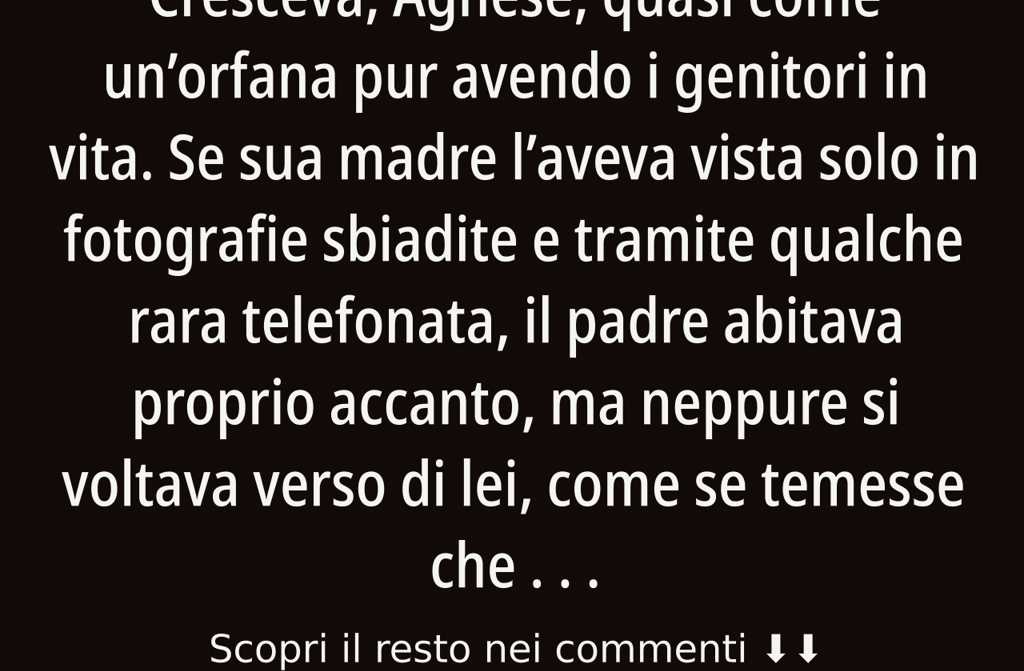 Cresceva, Agnese, quasi come unorfana pur avendo i genitori in vita. Se sua madre laveva vista solo in fotografie sbiadite e tramite qualche rara telefonata, il padre abitava proprio accanto, ma neppure si voltava verso di lei, come se temesse che la ragazzina gli chiedesse qualcosa.
