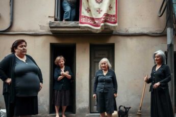 In un vecchio palazzo trascurato, una donna paffuta scuoteva un tappeto dalla finestra, senza accorgersi