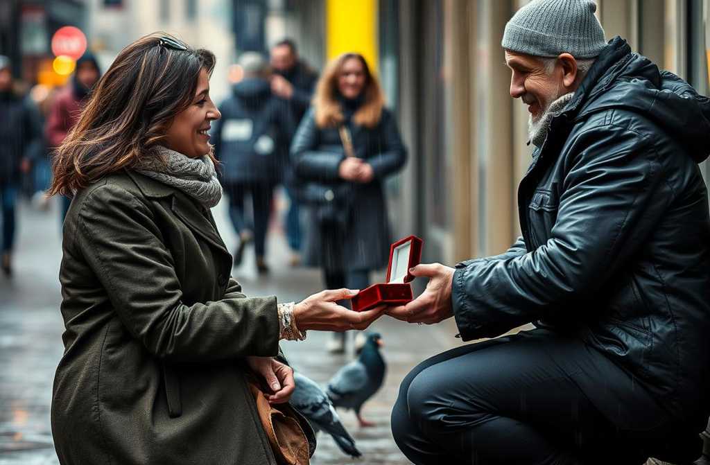 Il cielo piovigginava delicatamente, come un velo trasparente, mentre la gente passava con gli ombrelli aperti e lo sguardo basso. Nessuno notò la donna in un tailore beige che, in mezzo allincrocio, si mise in ginocchio. La sua voce tremava. «Ti prego sposami», sussurrò, stringendo tra le mani un vellutato portagioie. Luomo a cui si rivolgeva? Aveva la barba incolta, un cappotto rattoppato con lo scotch e dormiva in un vicolo a due passi da Piazza Affari.