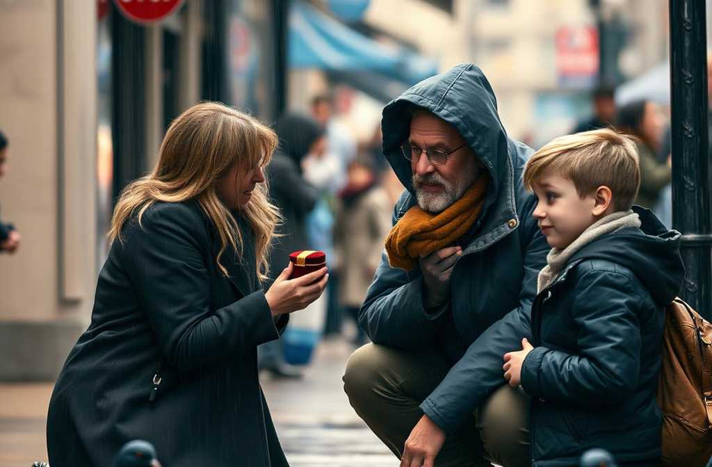 Il cielo piovigginava dolcemente, come una delicata tenda di pioggia, mentre la gente passava con gli ombrelli aperti e lo sguardo basso. Ma nessuno fece caso alla donna in un tailore beige che, in mezzo allincrocio, si inginocchiò. La sua voce tremava. «Ti prego sposami», sussurrò, tenendo tra le mani un cofanetto di velluto. Luomo a cui stava facendo la proposta? Non si radeva da settimane, indossava un cappotto rattoppato con lo scotch e dormiva in un vicolo a un isolato da Piazza Affari.