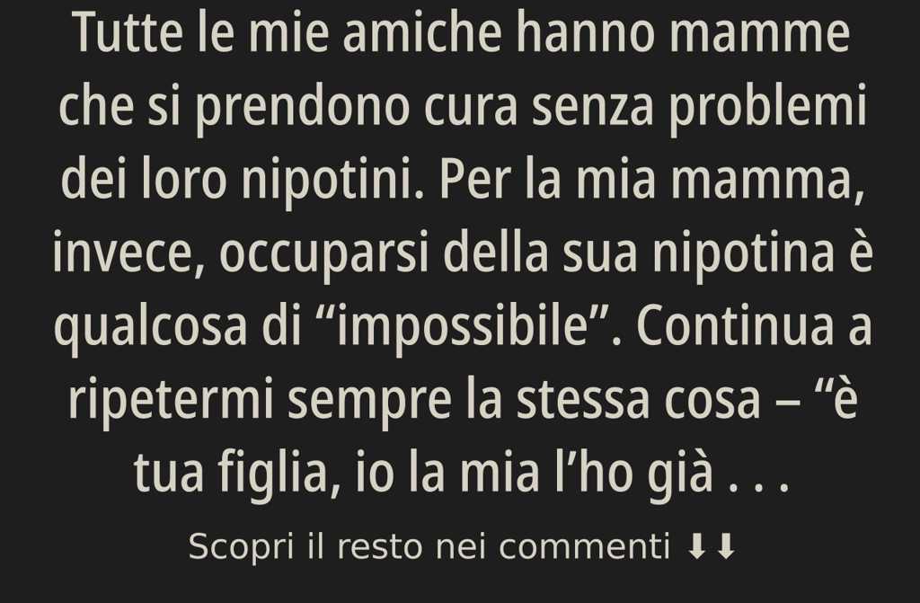 Tutte le mie amiche hanno mamme che si prendono cura senza problemi dei loro nipotini. Per la mia mamma, invece, occuparsi della sua nipotina è qualcosa di impossibile. Continua a ripetermi sempre la stessa cosa è tua figlia, io la mia lho già cresciuta. Mia figlia si chiama Lucrezia, ha cinque anni e frequenta la scuola materna. Due anni fa, dopo il congedo di maternità, sono dovuta rientrare a lavoro; insegno nella scuola primaria, dunque purtroppo non posso permettermi di chiedere giorni di ferie frequentemente. In queste situazioni sarebbe stato bello avere la mamma a disposizione.