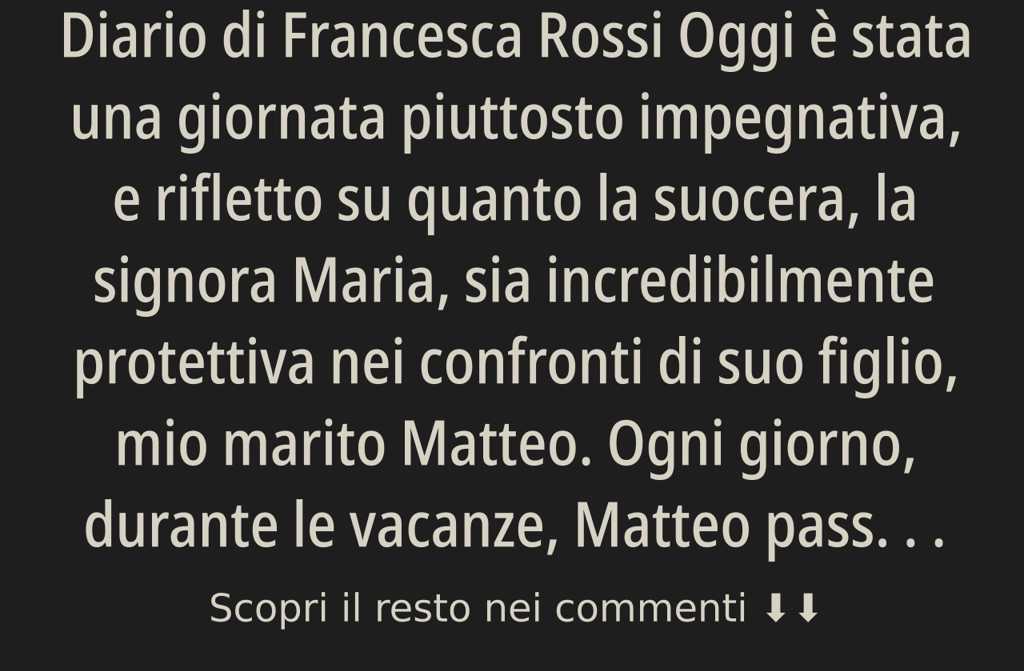 Oggi è stata una giornata piuttosto impegnativa, e rifletto su quanto la suocera, la signora Maria, sia incredibilmente protettiva nei confronti di suo figlio, mio marito Matteo. Ogni giorno, durante le vacanze, Matteo passa da sua madre a Milano per pranzare insieme. E ogni giorno riceve dei messaggi da lei: Hai mangiato? o Ti serve qualcosa?. Appena ha un problema, corre da lei per una soluzione. Se gli manca qualche euro, si rivolge direttamente a sua madre.