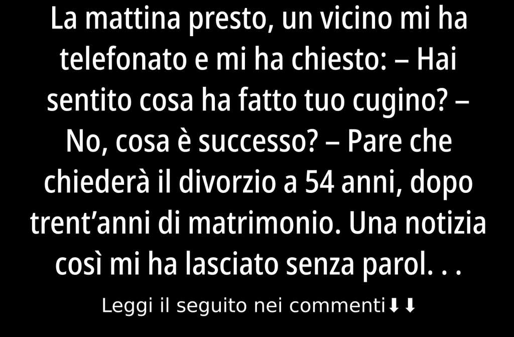 Una notizia così mi ha lasciato senza parole, come si dice qui, mi è cascata la mascella. Ma come, dopotutto sembravano una famiglia normale: lui non beve, ora è pensionato, nove anni più grande di lei. Hanno tre figli adulti che vivono per conto loro e già cinque nipoti. E improvvisamente lei ha deciso di divorziare.