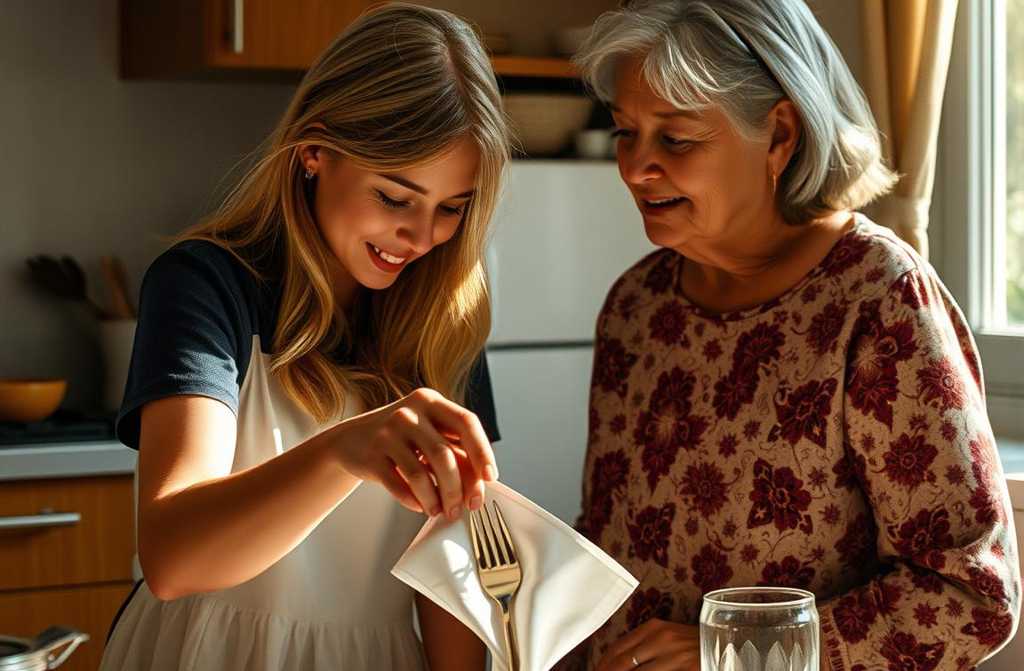 Zia mi ha offerto qualcosa da mangiare e ha iniziato a apparecchiare la tavola. Quando disponeva le stoviglie, ho notato che erano sporche. Mentre lei metteva qualcosa dal tegame, ho estratto dal sacchetto le salviette antibatteriche e ho cominciato a pulire le forchette.