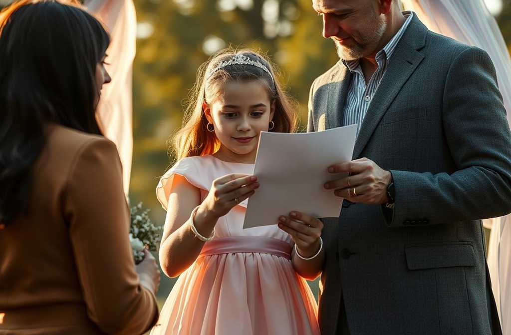 Vestita da damigella in rosa, si è avvicinata con la sua piccola borsetta di perline. “Scusi, nonna Rosa. Posso dire una cosa? Il mio nuovo papà, Luca, mi ha dato una lettera nel caso qualcuno fosse cattivo con la mamma”.