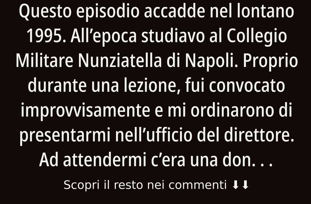 Questo episodio accadde nel lontano 1995. Allepoca studiavo al Collegio Militare Nunziatella di Napoli. Proprio durante una lezione, fui convocato improvvisamente e mi ordinarono di presentarmi nellufficio del direttore. Ad attendermi cera una donna, seduta in silenzio con laria profondamente abbattuta. Le lacrime le rigavano il volto e ogni tanto si asciugava gli occhi con un fazzoletto di stoffa.