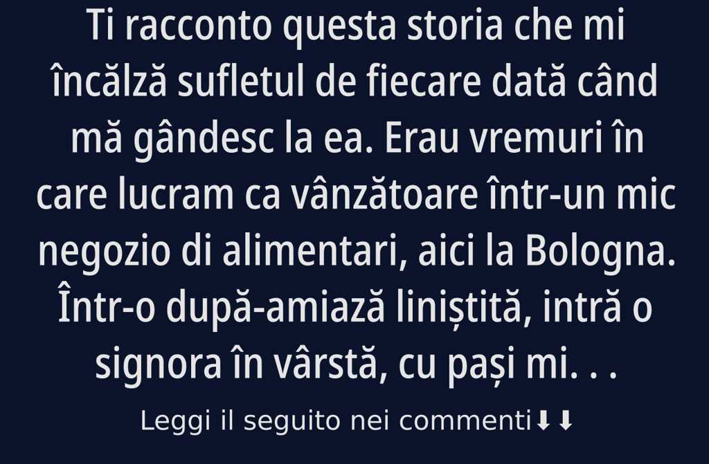 Ti racconto questa storia che mi încălză sufletul de fiecare dată când mă gândesc la ea. Erau vremuri în care lucram ca vânzătoare într-un mic negozio di alimentari, aici la Bologna. Într-o după-amiază liniștită, intră o signora în vârstă, cu pași mici și blânzi. Și-a ales câteva produse, dar la casă părea copleșită când și-a dat seama cât are de dus.