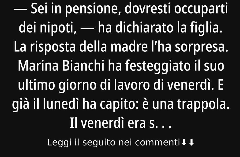 Domenica è uscita a fare una passeggiata da sola. Senza nipoti, senza borse, per il puro piacere di farlo. Ha camminato lungo lArno, ha preso un caffè in un bar con la vista sul fiume. Al tavolo accanto, una coppia della sua età rideva piano tra loro. Marina li guardava e pensava: la pensione non è la fine. È solo un altro inizio. Hai chiuso la partita doppia e inizi a vivere.