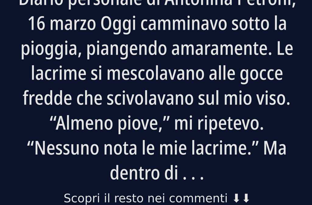 Oggi camminavo sotto la pioggia, piangendo amaramente. Le lacrime si mescolavano alle gocce fredde che scivolavano sul mio viso. Almeno piove, mi ripetevo. Nessuno nota le mie lacrime. Ma dentro di me non smettevo di riproverarmi: È tutta colpa mia! Sempre nei posti sbagliati al momento sbagliato, come unospite non invitata.