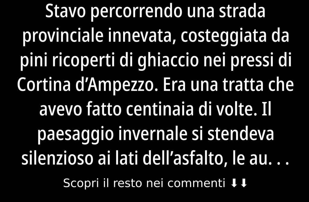 Stavo percorrendo una strada provinciale innevata, costeggiata da pini ricoperti di ghiaccio nei pressi di Cortina dAmpezzo. Era una tratta che avevo fatto centinaia di volte. Il paesaggio invernale si stendeva silenzioso ai lati dellasfalto, le auto erano pochissime, così abbassai la guardia, accesi Sanremo alla radio e lasciai che i pensieri scorressero tranquilli nella mia testa.