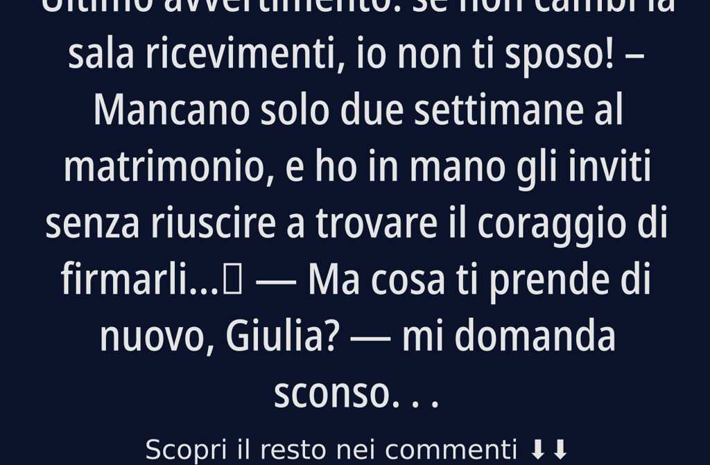 Ultimo avvertimento: se non cambi la sala ricevimenti, io non ti sposo! Mancano solo due settimane al matrimonio, e ho in mano gli inviti senza riuscire a trovare il coraggio di firmarli