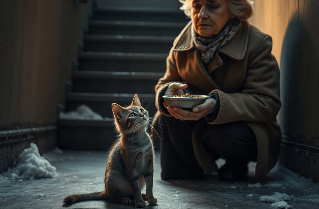 “Ecco, mangia. Poverina, non aver paura, non te lo porto via,” sospirò, osservando la gatta ingozzarsi affamata del riso con pezzetti di fegato.