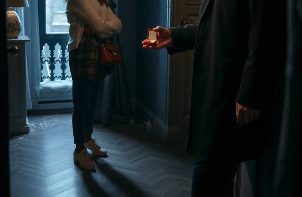 Lentamente si inginocchiò davanti a lei, le dita tremanti mentre prendeva dal cappotto un anellino. La luce della lampada fece brillare la piccola pietra incastonata.