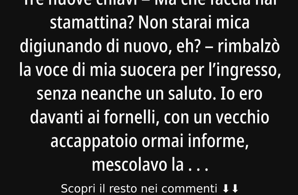 Ma che faccia hai stamattina? Non starai mica digiunando di nuovo, eh? rimbalzò la voce di mia suocera per lingresso, senza neanche un saluto.
