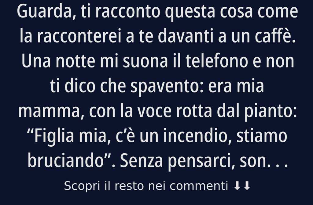 Una notte mi suona il telefono e non ti dico che spavento: era mia mamma, con la voce rotta dal pianto: Figlia mia, cè un incendio, stiamo bruciando. Senza pensarci, sono saltata giù dal letto. Casa dei miei sta a poco più di dieci chilometri da Firenze, grande, ma vecchia come il cucco. La città si sta espandendo, il paese ormai quasi si attacca alle sue ultime case. E io, mentre correvo in auto con Nicola, pensavo a quanti anni avesse, quella casa ce ne aveva ormai abbastanza.