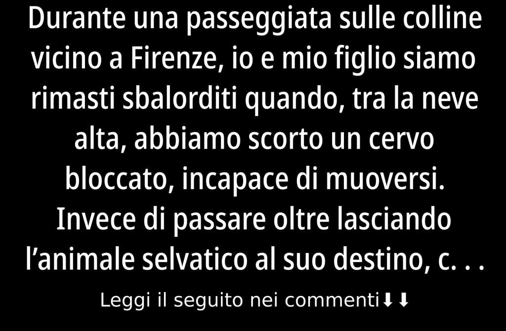 Durante una passeggiata sulle colline vicino a Firenze, io e mio figlio siamo rimasti sbalorditi quando, tra la neve alta, abbiamo scorto un cervo bloccato, incapace di muoversi. Invece di passare oltre lasciando lanimale selvatico al suo destino, ci siamo rimboccati le maniche e, armati di pale e mani, abbiamo iniziato a liberare il cervo da quella prigione bianca. Era davvero emozionante vedere mio figlio scavare con così tanto impegno accanto a me!