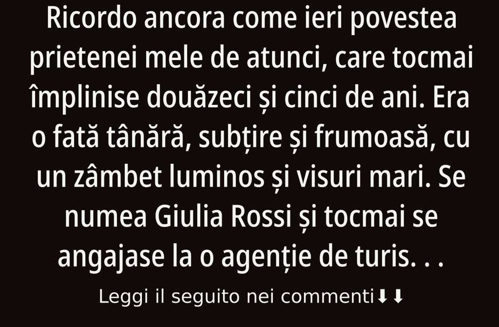 Ricordo ancora come ieri povestea prietenei mele de atunci, care tocmai împlinise douăzeci și cinci de ani. Era o fată tânără, subțire și frumoasă, cu un zâmbet luminos și visuri mari. Se numea Giulia Rossi și tocmai se angajase la o agenție de turism din Milano.