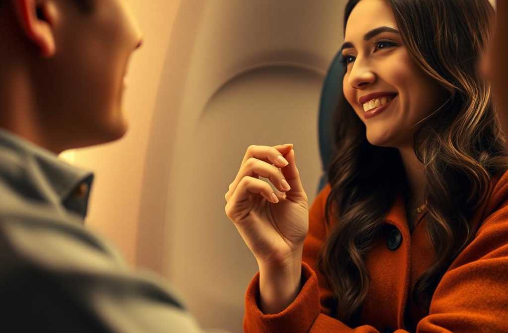 Laereo decolla. Cinzia, emozionata, fa cadere la borsa, ma Vincenzo le porge una mano senza parole per raccoglierla.
