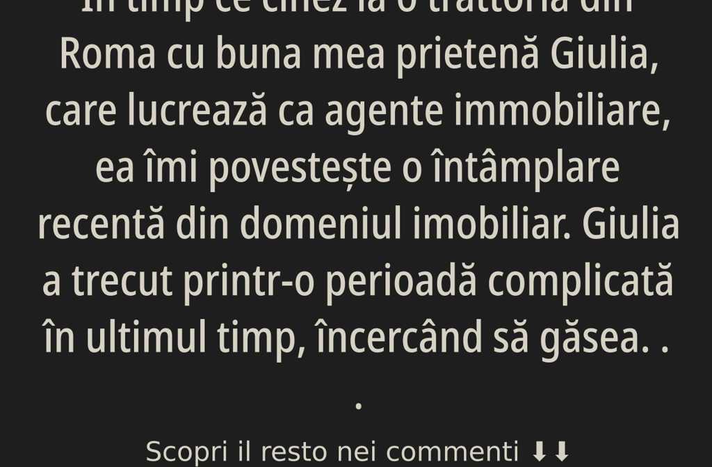 În timp ce cinez la o trattoria din Roma cu buna mea prietenă Giulia, care lucrează ca agente immobiliare, ea îmi povestește o întâmplare recentă din domeniul imobiliar. Giulia a trecut printr-o perioadă complicată în ultimul timp, încercând să găsească noi clienți. Cu toate acestea, păstrează un optimism molipsitor, convinsă că lucrurile încep să se miște în favoarea ei. Sarcina de a echilibra viața profesională cu rolul de mamă a doi copii și grija pentru mama sa în vârstă îi face viața zilnică și mai solicitantă.