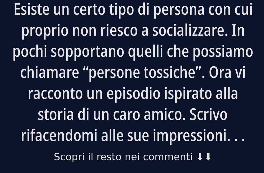 Esiste un certo tipo di persona con cui proprio non riesco a socializzare. In pochi sopportano quelli che possiamo chiamare persone tossiche. Ora vi racconto un episodio ispirato alla storia di un caro amico. Scrivo rifacendomi alle sue impressioni su questa esperienza.